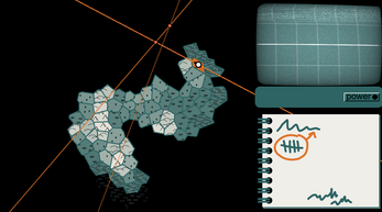 The notebook indicates your progress. Green scribbles represent strong radio signals. Orange scribbles occur when your bearing lines intersect near the radio source.